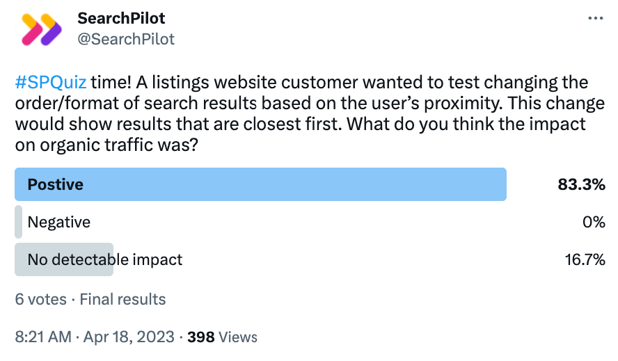 In this week’s #SPQUIZ case study, we asked our followers whether they thought that we could improve organic traffic by removing ad listings that were not in the same location as the page. How did this change impact SEO performance?